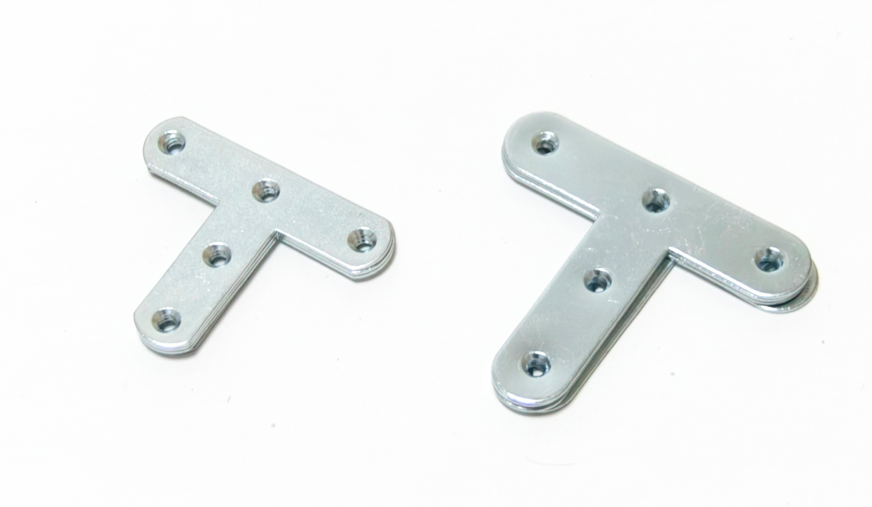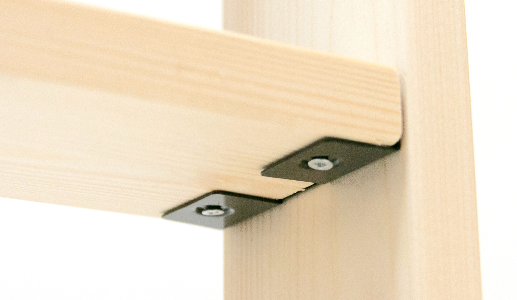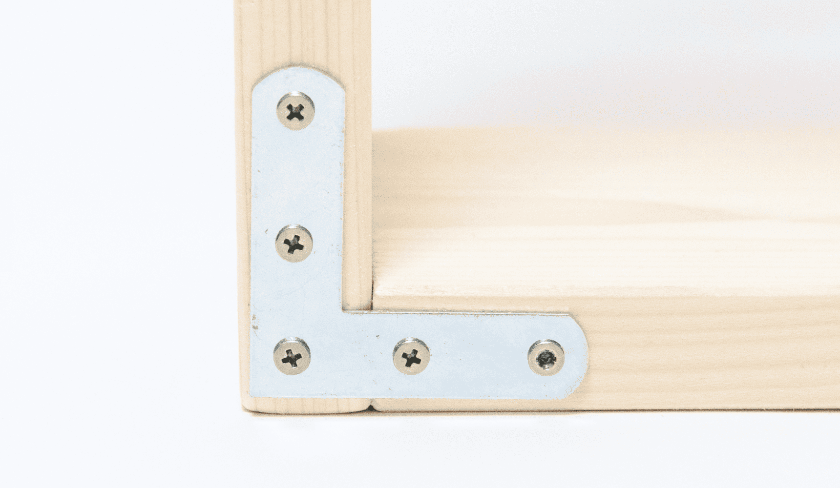 フラット型(平板タイプ)は、平らなプレート状の金具で、最もベーシックなタイプ。棚板の裏側やフレームの角(直角箇所)に取り付けることで「たわみ・歪み・ぐらつき防止」に効果的です。取り付けが比較的に簡単です。