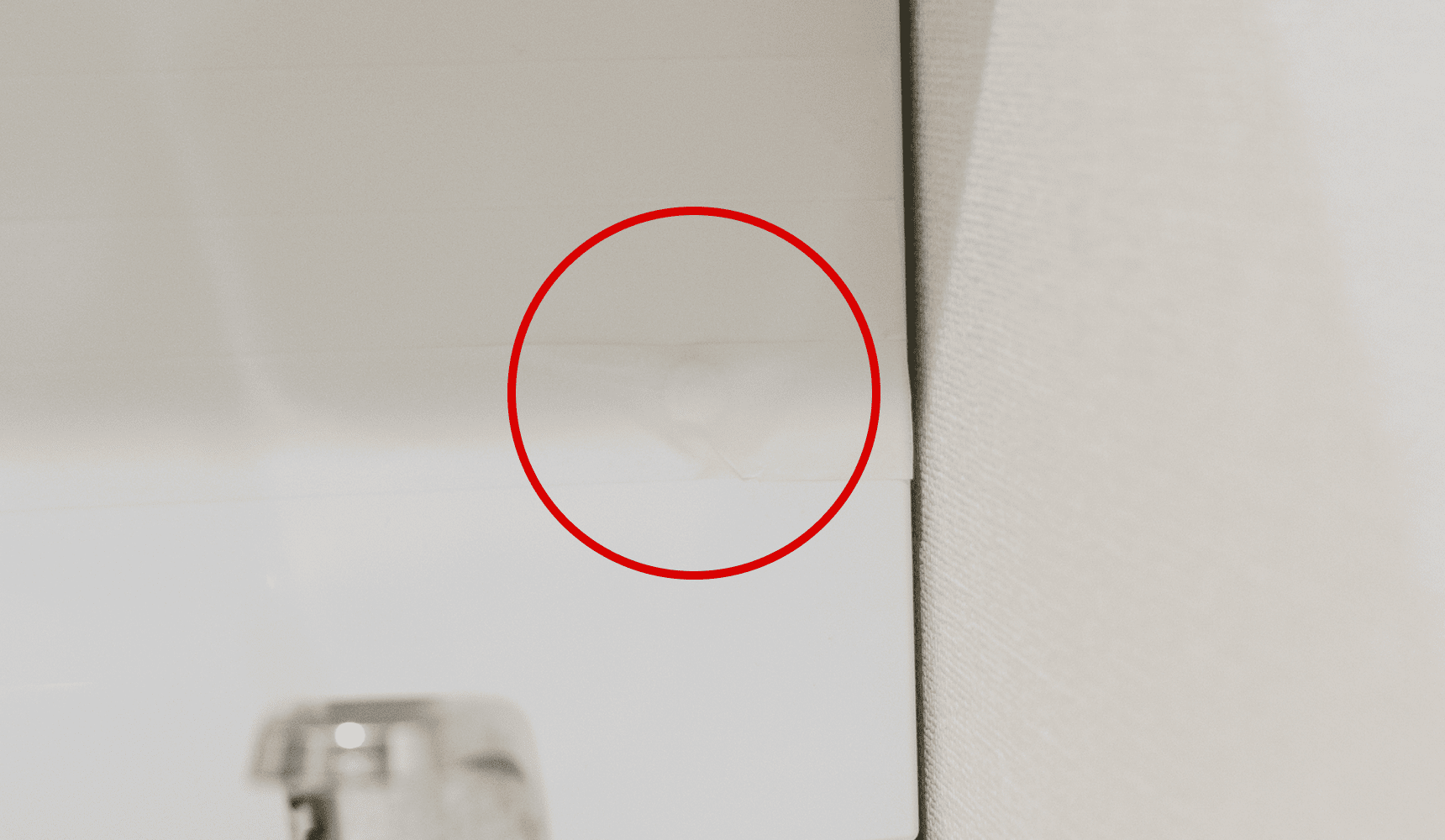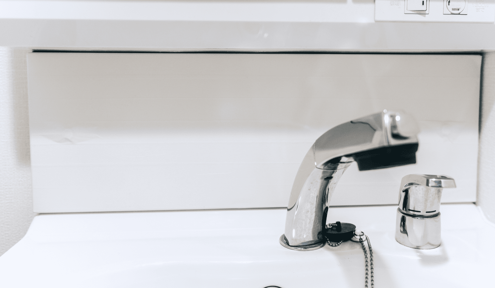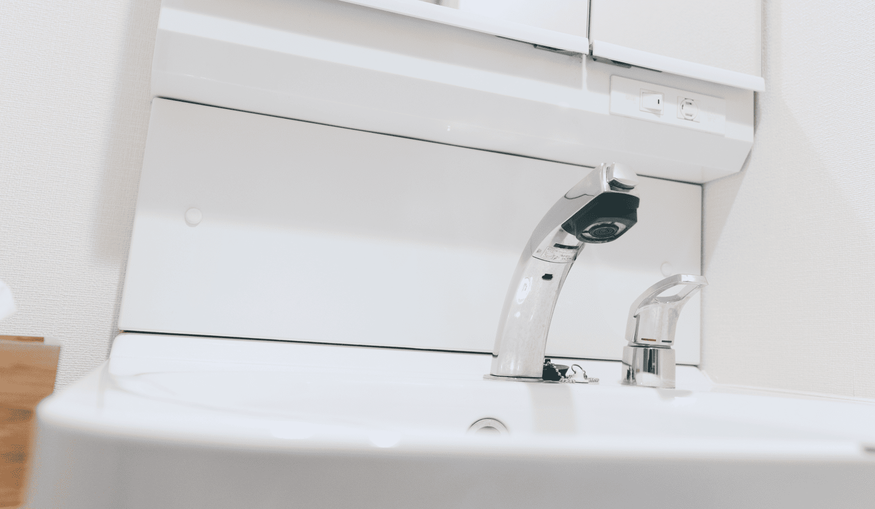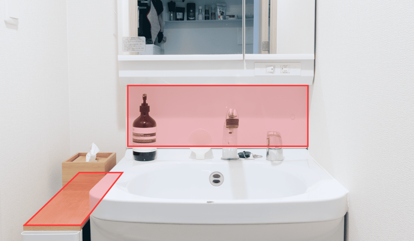 取り付ける面を確認していきます。まずは洗面台の鏡下をチェック。樹脂素材のためそのまま貼り付けできそうですが、退去時の作業を考えて下地にマスキングテープを貼ることにしました。