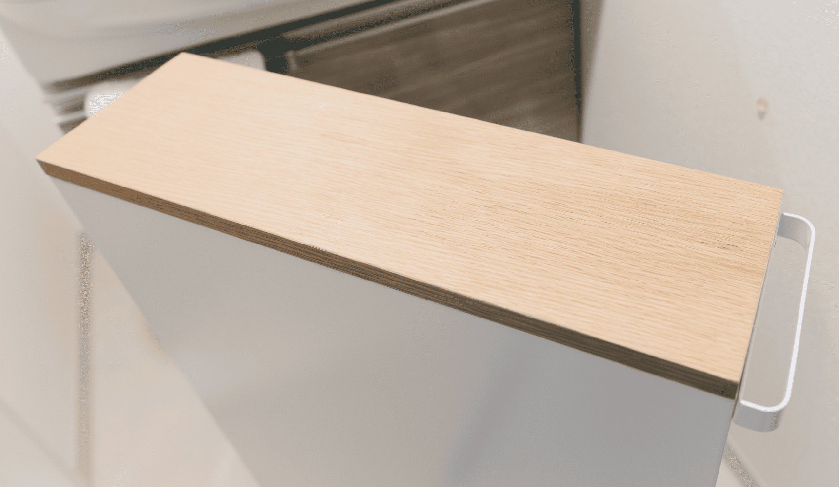 一方、ワゴンの天板は木製できれいな平らです。購入品ですが、こちらも念のためマスキングテープを貼ります。