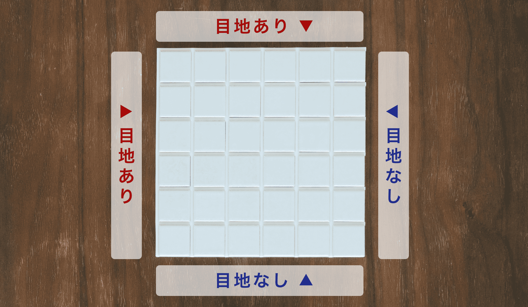 タイルシールをカットする前にぜひやっておきたいのが、貼り付けのシミュレーションです。実はタイルシールには、製品によって「向き」があります。今回使用したタイルシールには、目地がある辺とない辺がそれぞれ2辺あります。この向きを気にせず貼ってしまうと、タイルの並びが不均一に見えてしまいます。