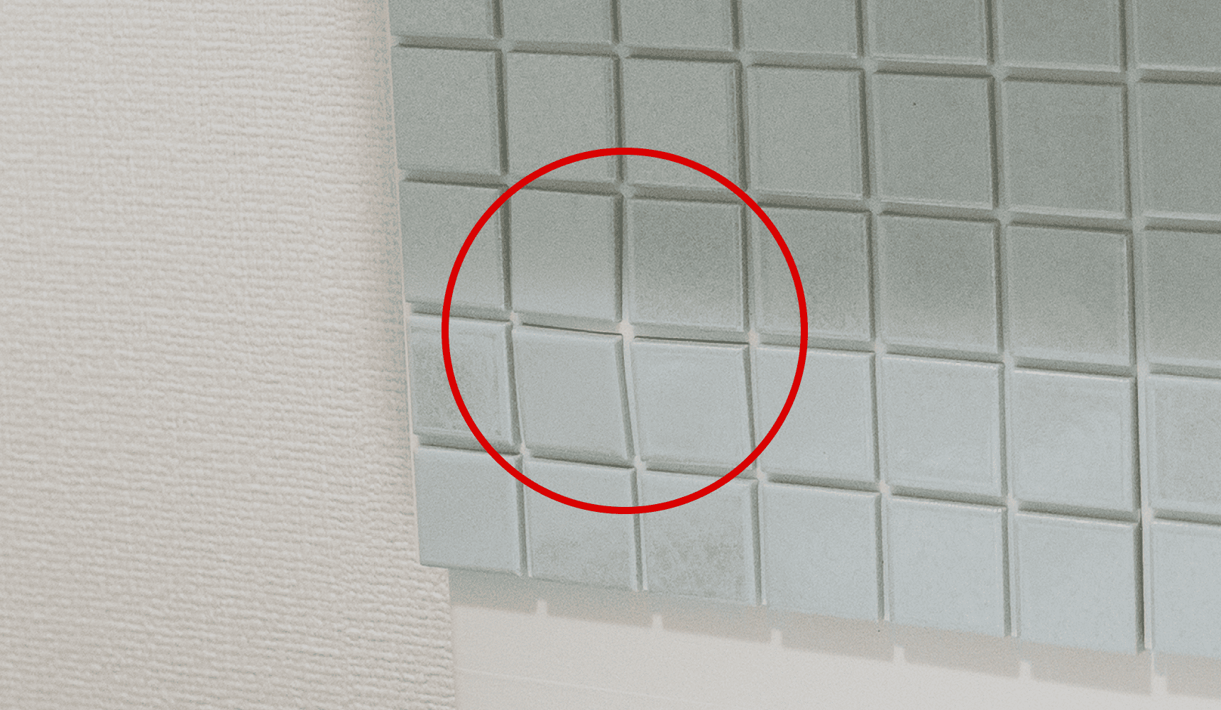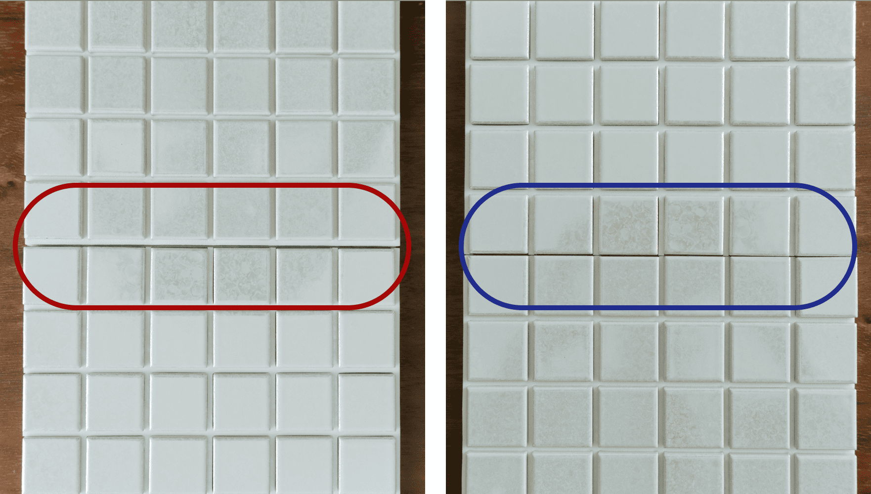 写真右)目地の向きが誤っている状態。囲んだ部分だけ、タイル同士がくっついてしまう。