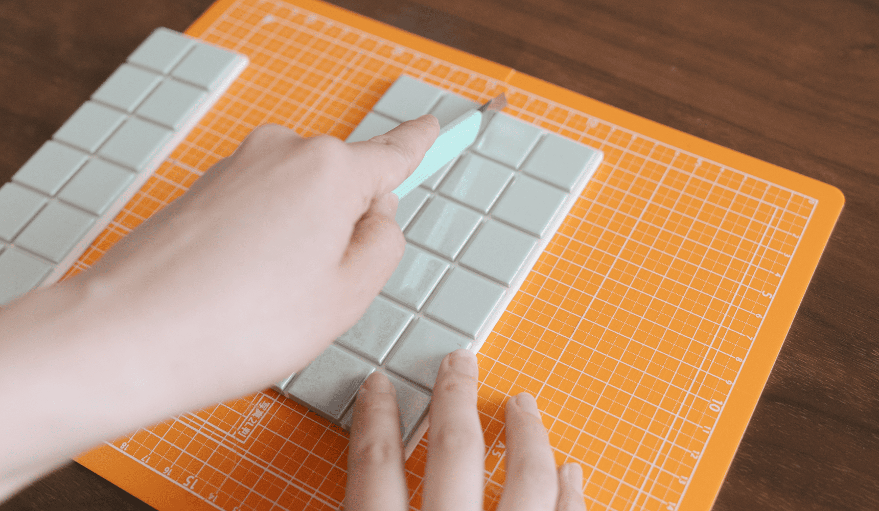 続いて、タイルシールをカットします。目地は塩化ビニール樹脂製でスポンジのような感触。タイルの側面に沿ってカッターを入れると、定規がなくてもきれいに切ることができました。