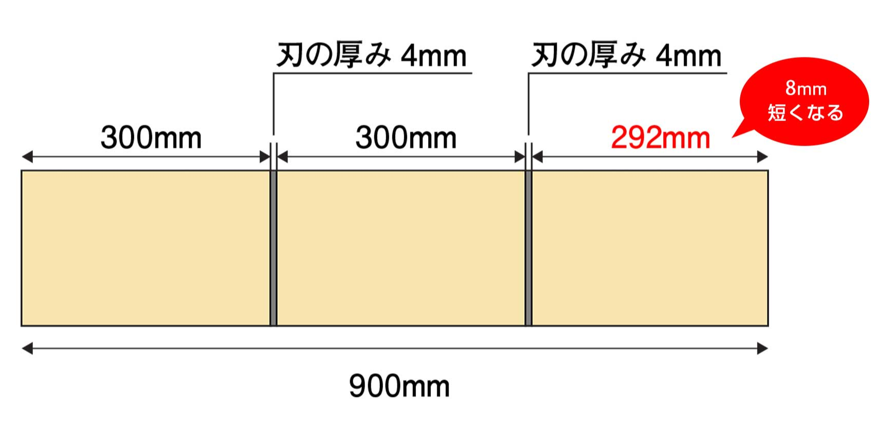 - 例えば、刃の厚み4mmの機械で900mmの板を3等分にカットしようとすると、3カット目の長さが6〜8mm足りなくなります。木材を選ぶ際は、カット数などを考慮して、切りシロを含めた少し余裕のあるサイズを選びましょう。
