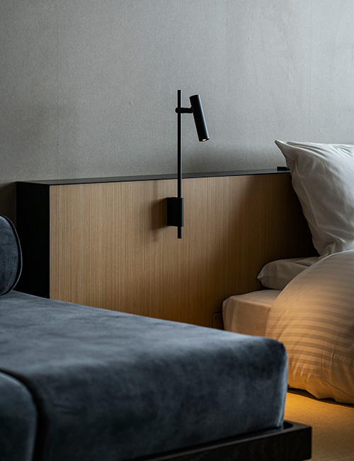 フロントだけでなく廊下や客室など、ホテル全体の照明は必要最低限。部屋全体を煌々と明るくしないことで壁の存在感が薄らぎ、閉塞感も軽減。光の影のメリハリをつけることで、空間をよりシンプルに見せることができます。