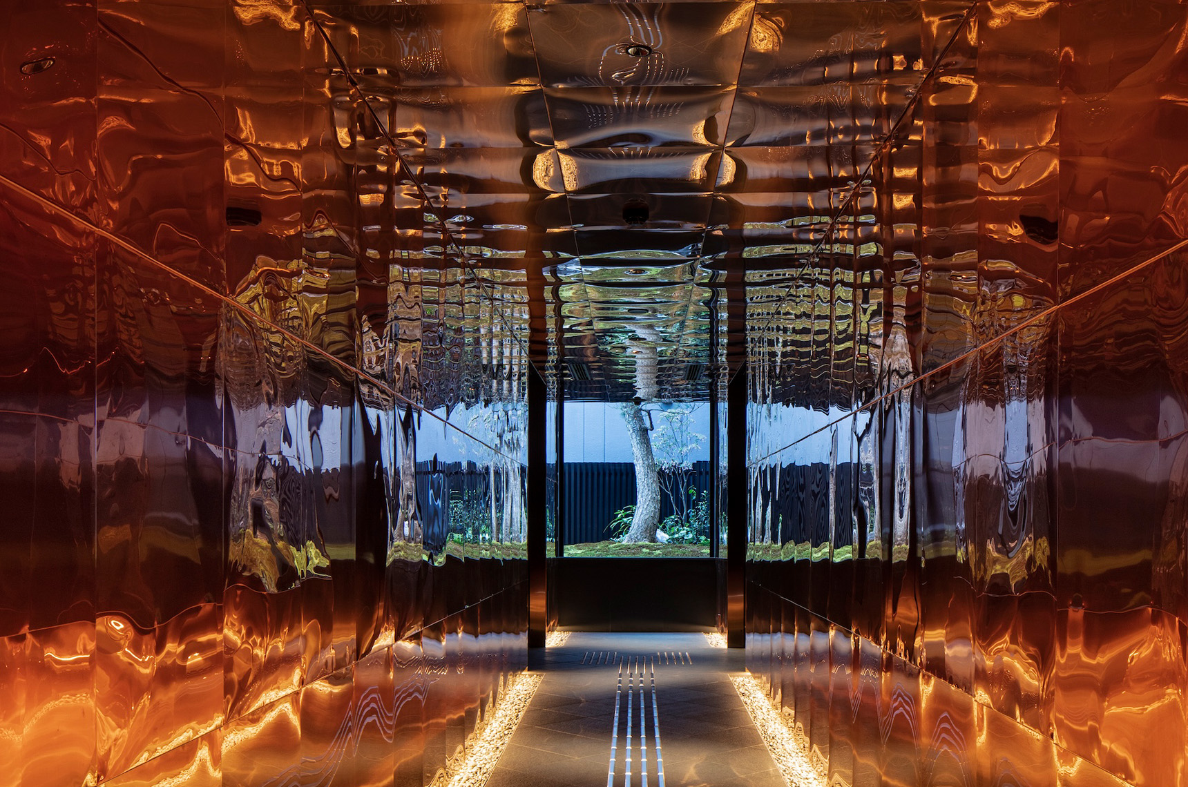 ホテルの入り口を入ると、銅板にぐるりと囲まれたトンネルのような通路が出現。暖かで柔らかい反射を奥に奥に…と進むごとに日常と切り離され、“特別な場所”にやってきたような気持ちに。