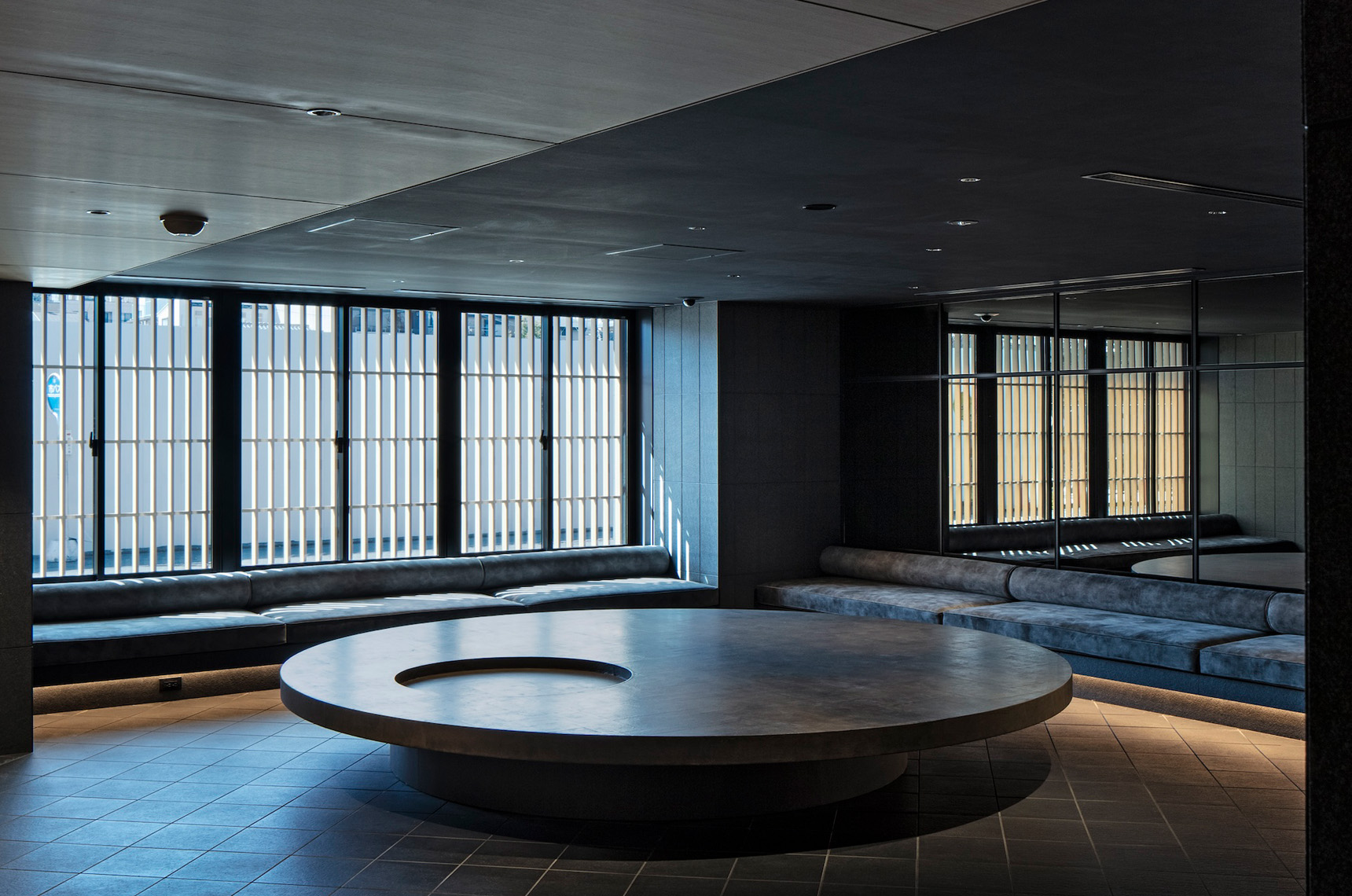 銅板で囲まれた通路を抜けロビーに入ると、最初に目に入るのは、窓から見える街の風景。照明を最低限の明るさにすることで自然光が際立ち、気が付いたら窓に目が行く仕組み。右奥の壁は一面鏡で空間の広がりも感じ、ゆっくり景色を眺めていると頭や体のスイッチが少しずつ休息へと切り替わるのが実感できます。