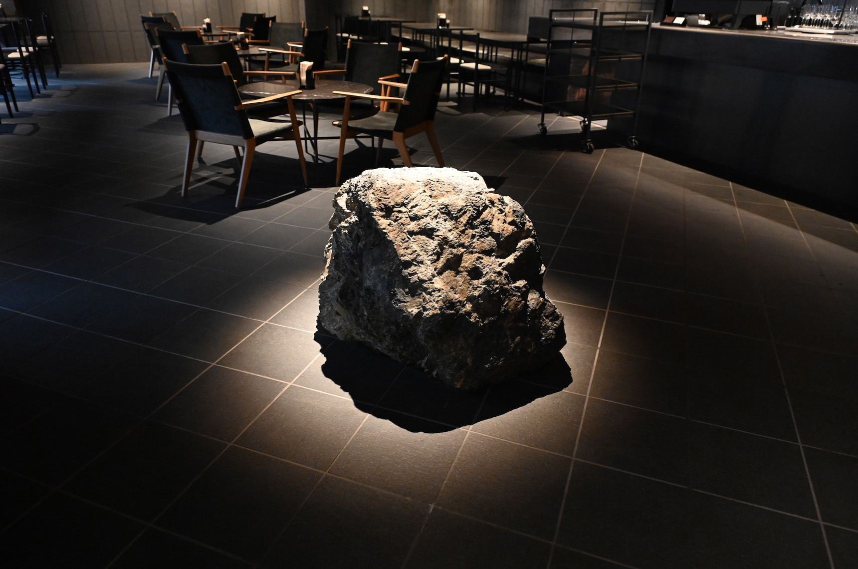 フロント、レストラン、大浴場など、館内にはホテルを象徴する7個の大きな石「迎石(げいせき)」が設置されています。「造園クリエイターの橋本善次郎さんが選んだ閃緑片岩なんです」(藤山さん)
