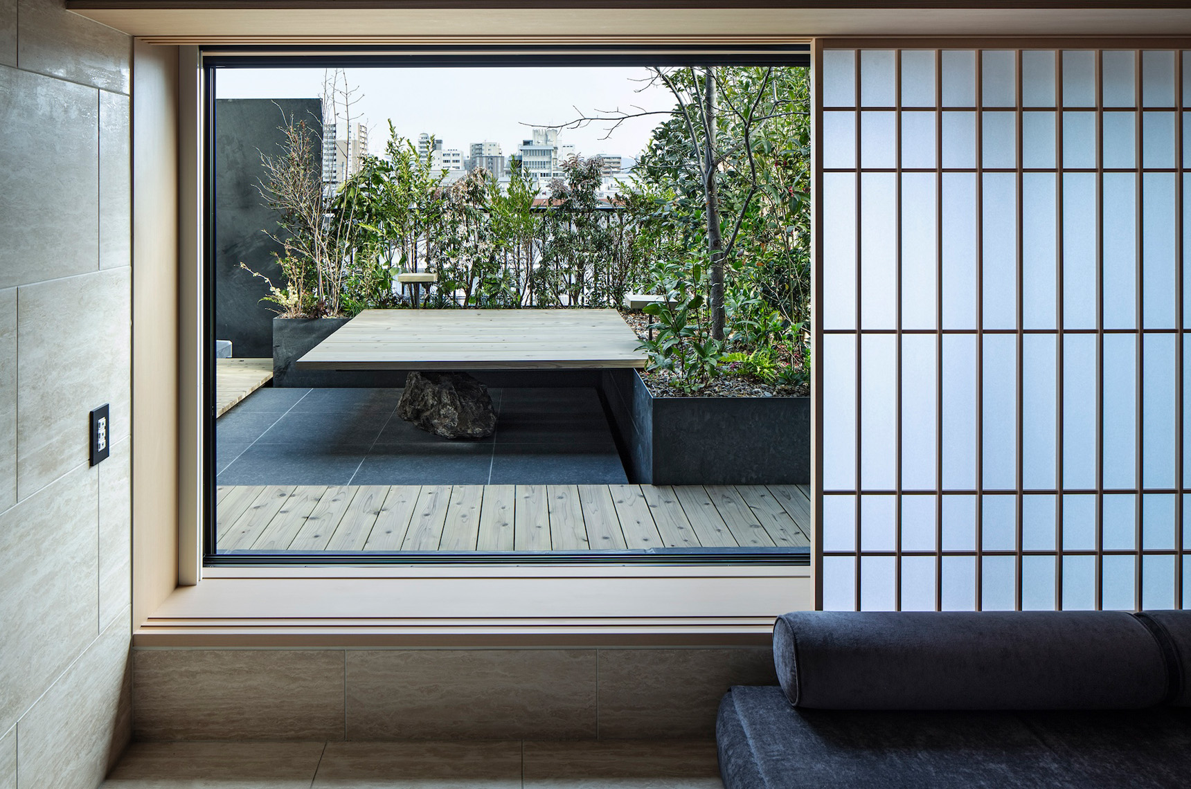 ソファ側には茶室の入り口のような窓があり、テラスに出て風を感じながら食事を楽しんだり晩酌をしたり、リビングのような使い方ができるのも魅力。まわりに高い建物がなく、視線を気にせずくつろげるのは京都ならではです。