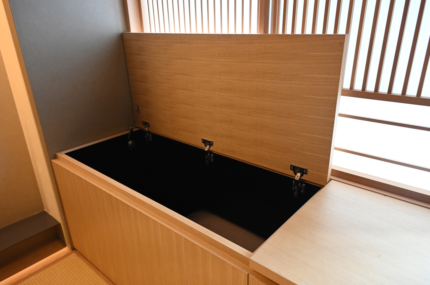 「この窓際のベンチは蓋が開いて、中はたっぷり収納スペースになっています。ベッドのマットレスの下に布団を収納できたり、実は各部屋大容量の収納スペースが確保されています」(原さん)。Point2で紹介した、用途を兼用できる家具でもありますね。