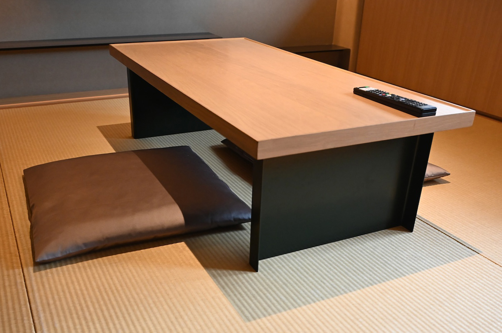 障子、畳、と和で統一しているのかと思いきや、テーブルの脚はアイアン。座布団カバーも光沢のあるシルバーのサテン生地で、絶妙なバランス。