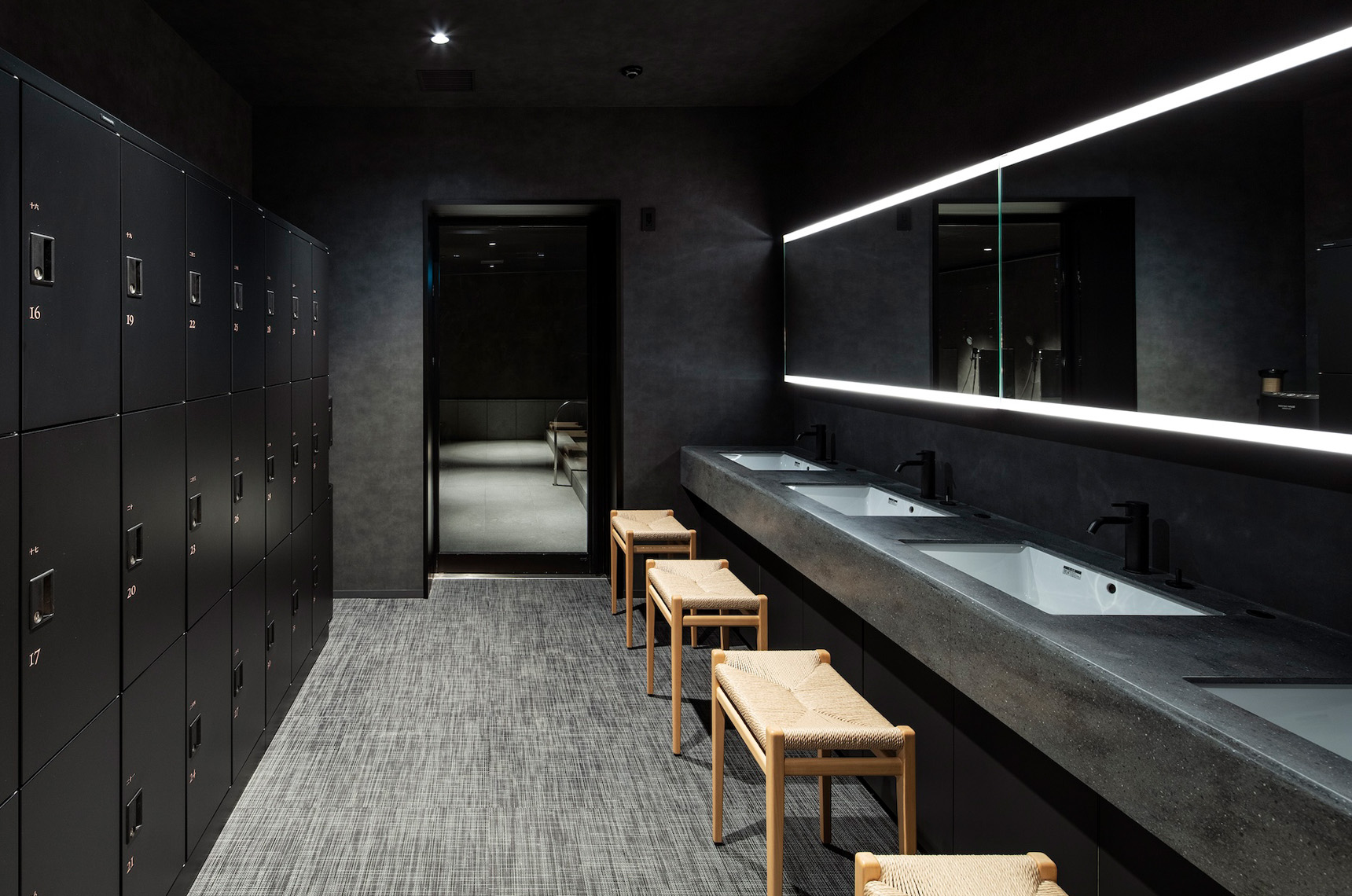 グレーに統一された、大浴場の脱衣所。洗面台までグレーのカバーで隠されていますが、スツールが空間を引き締めるポイントに。塗装されたアイテムではなく、木目とペーパーコードの素材そのものの色と質感が差し色の役割を果たし、際立つアクセントになっています。