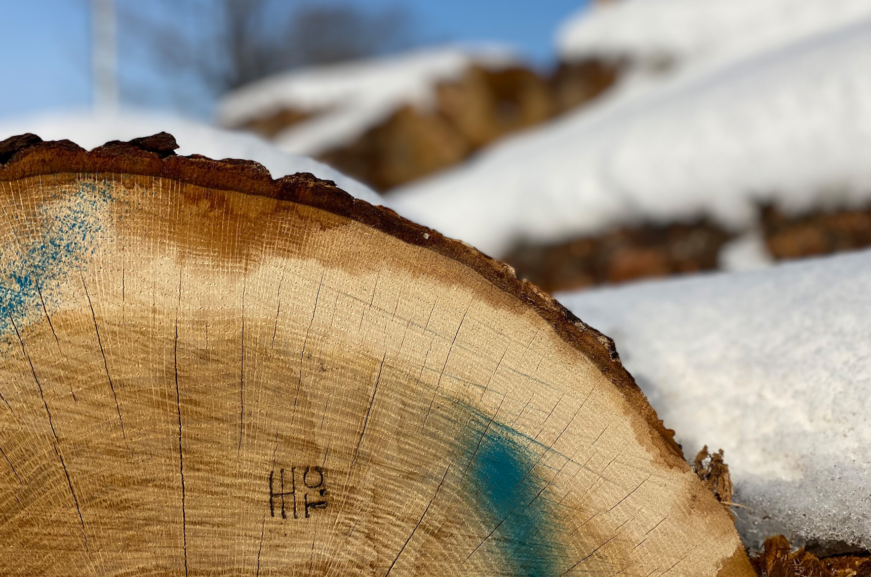 安多化粧合板株式会社では、世界各地の木を取り揃えていますが、国内では主に北海道の大雪山周辺に生えるミズナラという広葉樹を主に使っています。一般的には材料になる木を切って山から降ろした後、角材などに加工します。一方、安多さんたちは自分たちで切った木をその場でスライス。すると他社では出せない木の模様に出会えるのだとか。