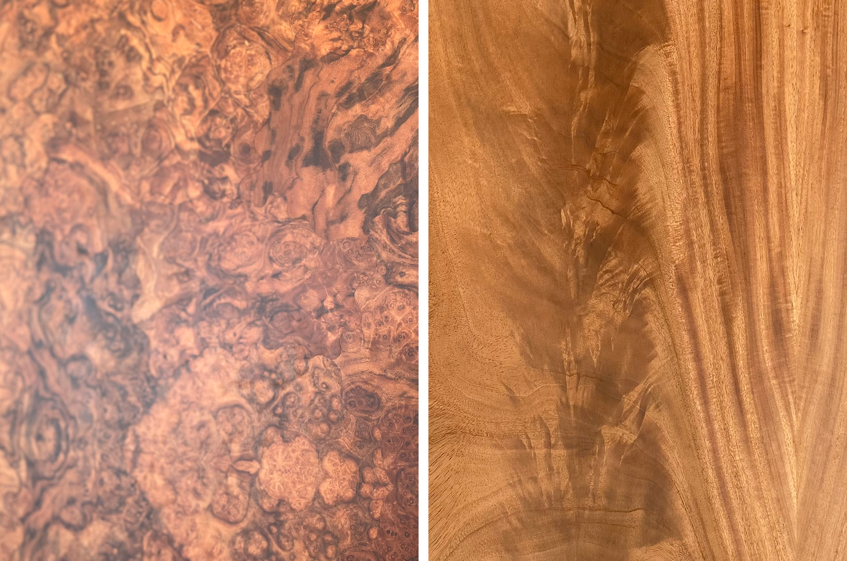 ▲ (写真左)アップル=リンゴの木。(写真右)Truffle-Beech=キ菌根(トリュフ)と共生したブナ。(画像提供:安多化粧合板株式会社)