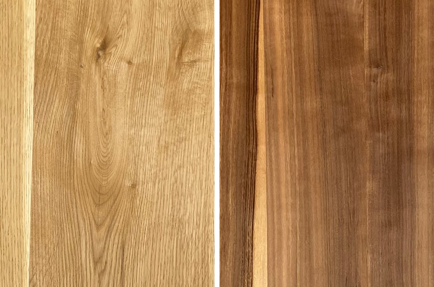 ▲ (写真左)大雪山のミズナラ=ドングリの木。(写真右)Fumed-cherry=さくらんぼの木。(画像提供:安多化粧合板株式会社)