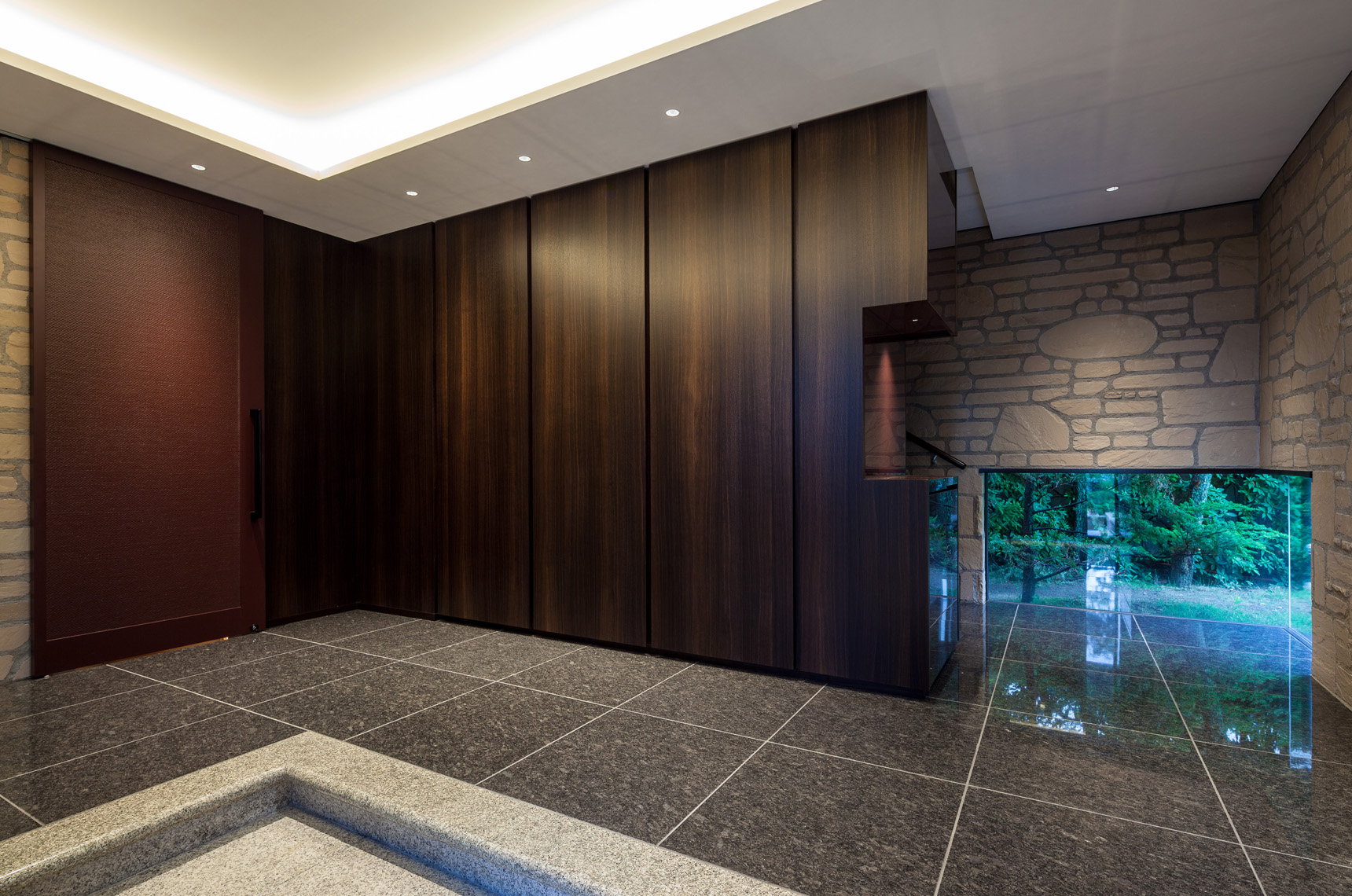 ▲ 玄関正面の空間に天井まで届く大きな収納棚に、燻製のオーク独特のグラデーションが映える。物件名:House Ashiya、設計:Design Works Sol、写真:Stirling Elmendorf Photography、樹種:ファムドオーク(画像提供:安多化粧合板株式会社)