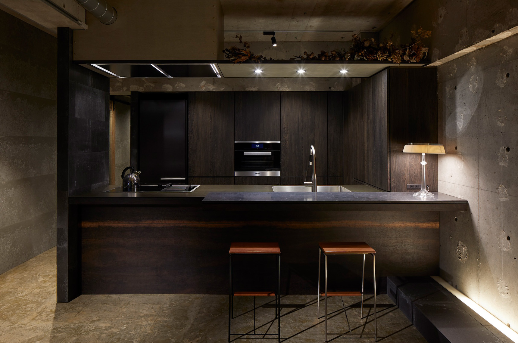 ▲ 数千年間も泥の中で保存された黒褐色が特徴の、ボグオークを背面の棚に使用。物件名:入船の家、設計:STUDIO KAZ、樹種名:BogOak8000年、ファムドユーカリポメレ(画像提供:安多化粧合板株式会社)