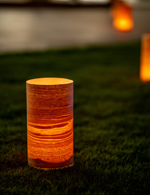 ベッドサイドのランプシェードを突板にすると、光の中に木目の模様が浮き出ます。あるいは室内のスポット照明を使って、お気に入りの木目模様が際立つよう、突板を置いてみます。光と影で木目を活かす表現で、その場が癒しの空間に変わります。