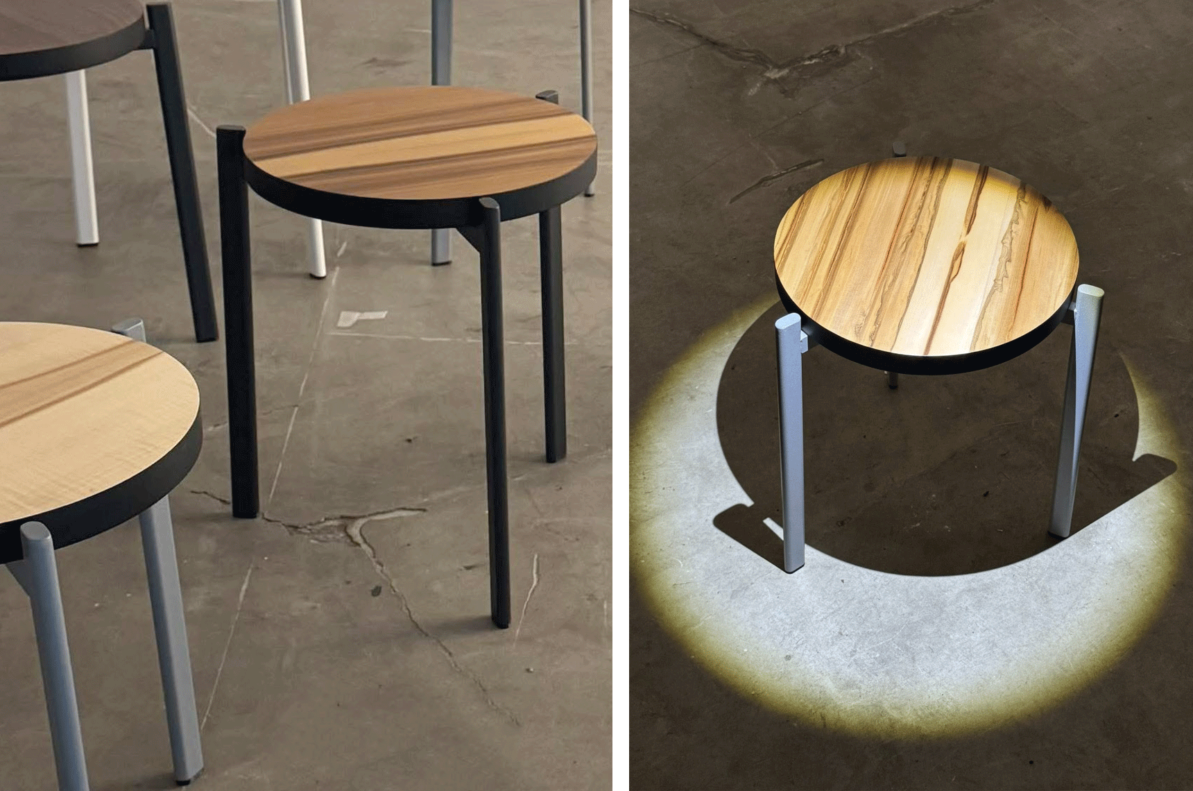 レディメイドとは、「すでにある素材から、新しい価値やアートを生み出す」考え方のこと。座面には安多化粧合板の突板を、脚部には株式会社摂津金属工業所の金属加工技術を用い、2社の技術を“積み重ねる”ことで一脚のスツールが完成しました。量産品ではなく、ひとつひとつに木の個性が宿る特別な一点物。部屋に置くだけで、実用品でありながらアートピースのような存在感も放ちます。