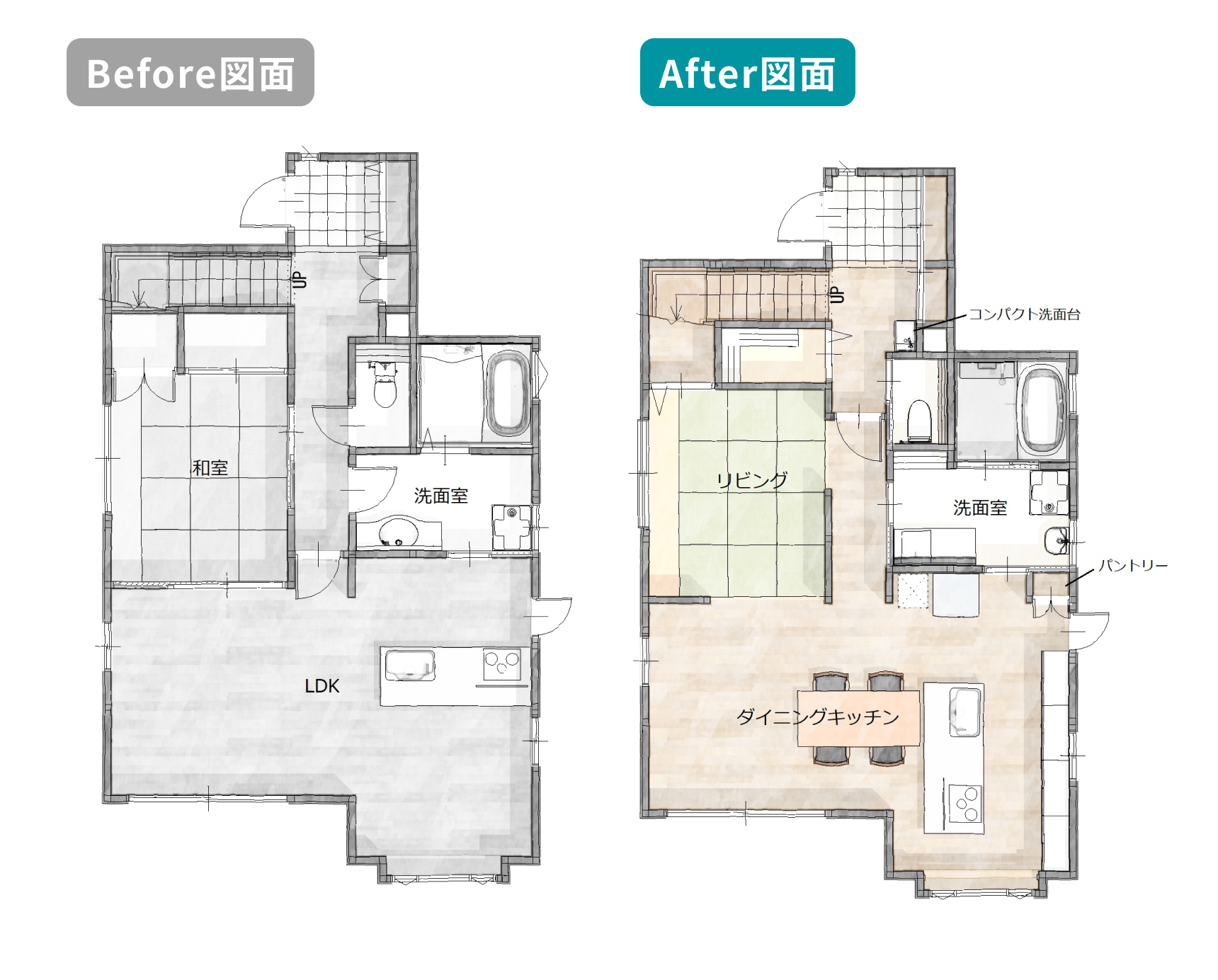 - 故障してから慌てて設備交換だけをするのではなく、古くなって汚れが落ちない床や壁をあわせて変えることで理想のリフォームが叶います。また、まずトイレをリォームして、1年後に洗面台をリフォームして…と個別にリフォームするより、まとめて水回りをリフォームした方が片付ける手間も省けて工期が短くなり、コストもかかりません。さらに、キッチン・洗面室・トイレはまとめてリフォームする方が、無駄に広かったトイレの面積をすこし狭くして洗面室を広くする、など「できること」が増えてよりフレキシブルな工事ができるようになります。
