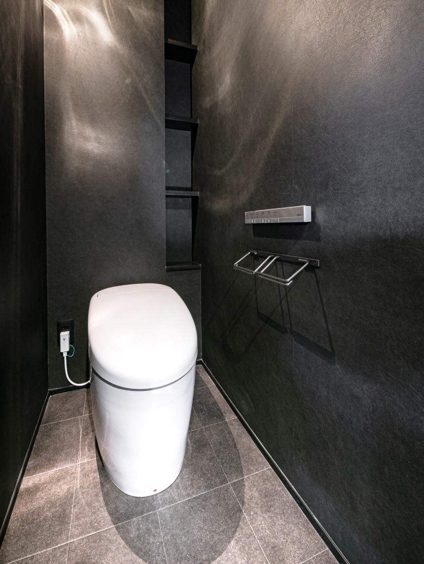 昭和を感じるデザインのトイレから、壁・ペーパーホルダー、棚板、換気扇まですべて黒で統一。大好きなブラックインテリアをトイレ空間にも反映して、見せたくなるようなトイレスペースへと生まれ変わりました。